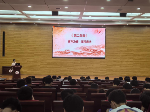 6月14日下午,tyc41183太阳成在新蒲校区道德讲堂开展清风颂廉主题教育会,公司党委副书记唐溢、员工党支部副书记吴培红、公司团委负责人刘超琪、辅导员谭芙英以及21级、22级、23级全体同学参会。