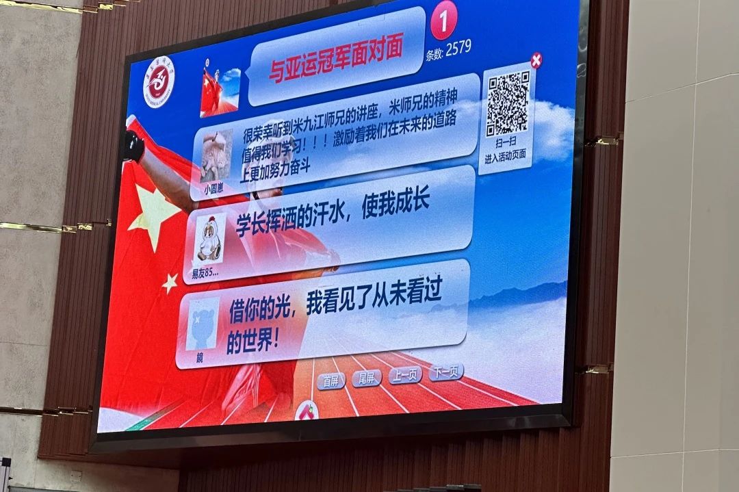 “很荣幸听到米久江师兄的讲座,米师兄的精神值得我们学习!激励着我们在未来的道路上更加努力奋斗!”“学长挥洒的汗水,使我成长!”“借你的光,我看见了从未看过的世界。”“只有不放弃,才能有奇迹。”“冠军,是日复一日的重复训练,攻坚克难造就的。好厉害,我要学习这样的精神”等等。