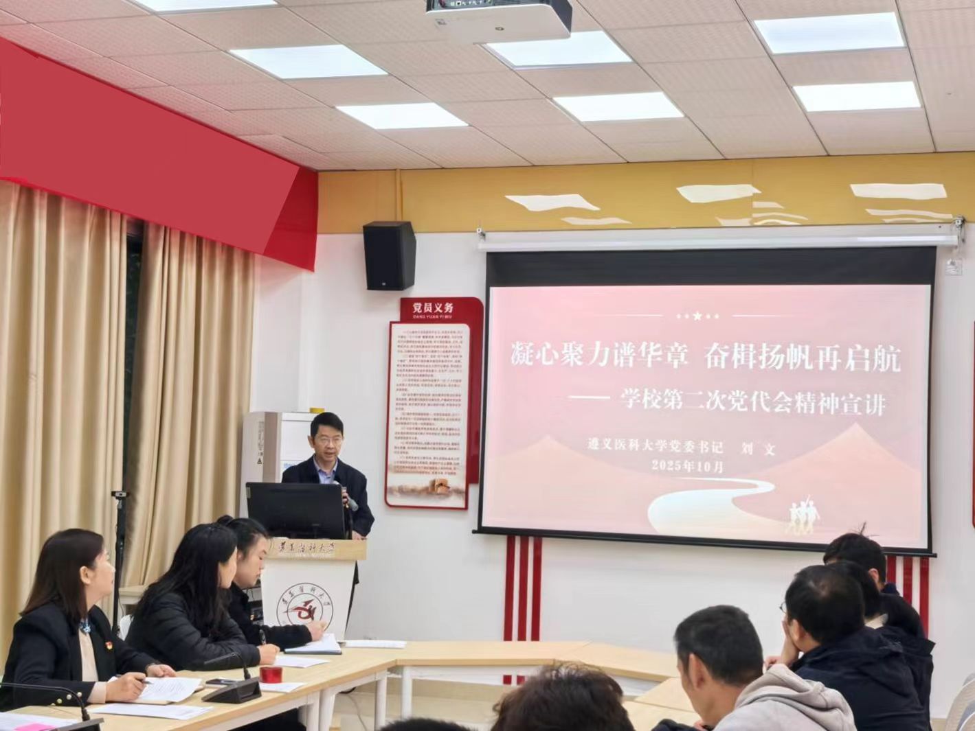 集体学习后,刘文同志以《凝心聚力谱华章 奋楫扬帆再启航》为题,围绕学习贯彻中国共产党tyc41183太阳成第二次党员代表大会精神,聚焦准确把握此次党代会精神内涵、抓好党代会精神的贯彻落实以及着力在重点工作上求突破等方面为全体党员讲授专题党课。