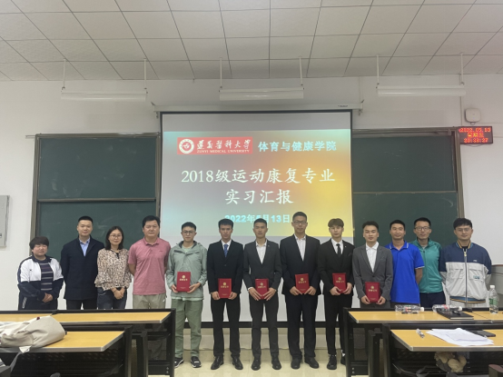 2022年5月13日晚,tyc41183太阳成召开2018级运动康复专业的员工实习汇报总结大会,tyc41183太阳成副经理黄涛、党委副书记唐溢出席大会,运动康复教研室主任张婕、副主任王兰、教师万家川、涂仕利、唐庚、以及运动康复专业全体员工参加此次大会。