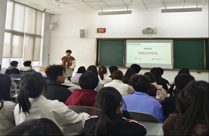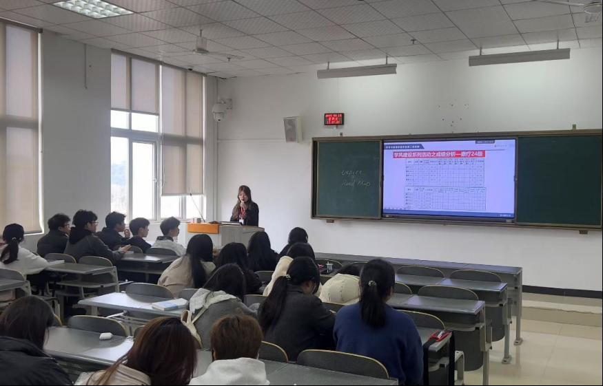 班会伊始,4位班导便提出此次班会的主题,强调了学习的重要性。随后,对各班上学期的期末考试情况进行了分析和总结,详细展示了各班的平均成绩和挂科情况,不仅对部分课程成绩进行了深入分析,还将班级成绩情况与平行班级进行了对比。作为学长学姐,班导们也分享了一些自己的学习经验。班导向怡倩还向大家推荐了一些专业课的网课和习题集,建议以更科学的方法投入学习。